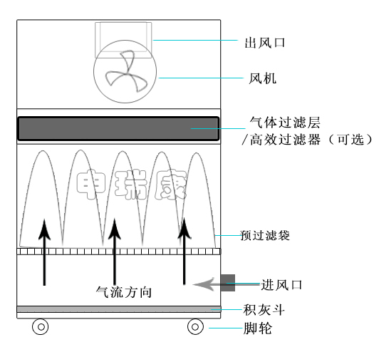 5.倒置進風設計,袋式過濾,大顆粒粉塵會沉降至底部積灰鬥,最大程度增加了容塵量。